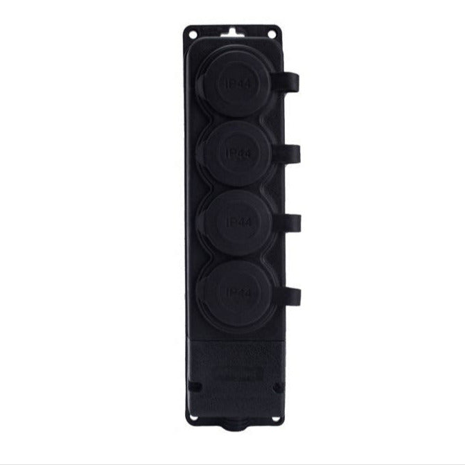 Kvalitetna crna 4 x "gumena" hermetička utičnica s zaštitom IP44 (s poklopcem) sa standardom uzemljenja Tip E (kolik), 16 ampere 250 volti, proizvođač Bylion