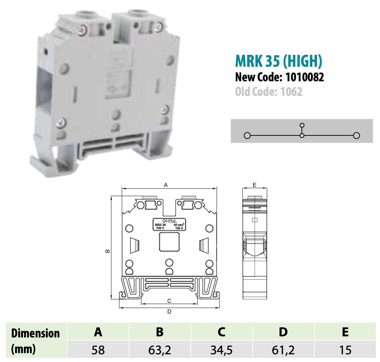 ONKA 35mm2 Vijčana šinska spojka stezaljka Terminal na DIN tračnicu 2-žična siva, 1010082