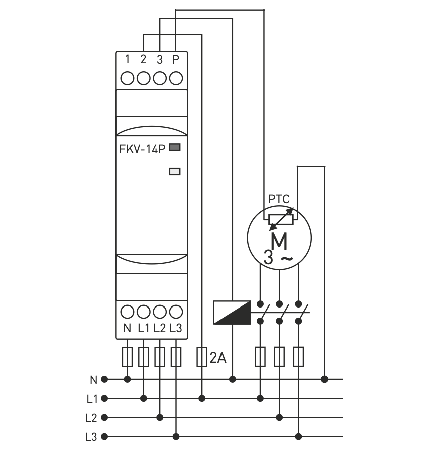 Trofazno nadzorno / zaštitno relé za kontrolu redoslijeda, prekida, asimetrije faza s toplinskom kontrolom s PTC ulazom. FKV-14P (TENSE)